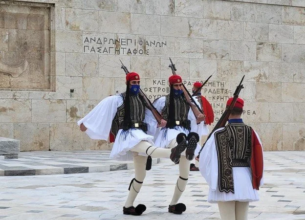 Syntagma Square is the place to watch the shift exchange of the guards at the Monument of the Unknown Soldier in front of the Hellenic Parliament and the Presidential Mansion. I was excited to see the Israeli flag hanging next to the Greek. I guess the Israeli president and I had the same epiphany, and he, too, was in Athens. Though it was Thursday, the guards wore their Sunday uniforms for the presidential visit. (the festive ceremony exchange takes place every Sunday at 11:00 am ). For me, the real attraction of the shift exchange was the “horse” like moves that the guards performed. These unusual moves reflect how strong a tradition is. The tale goes that when the 17-year-old King Otto moved from Bavaria to Greece to take the throne (in 1832 ), he could no longer hear the sounds he loved – that of horses. So he made his guards walk in this fashion to replicate the sound and make him feel like he was closer to home.. Everyone has strange habits. (even Leaders). It can be nice if we all get more curious about ourselves and each other. There is always a reason why we do things. Knowing means, we can act differently if it doesn’t serve us anymore.